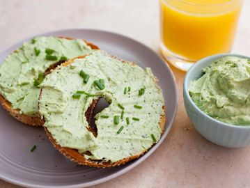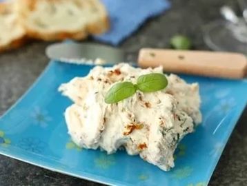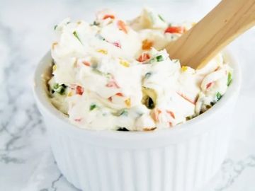 Soft cheese spread seasoned with freeze-dried green and red bell peppers, diced tomatoes, dill and salt